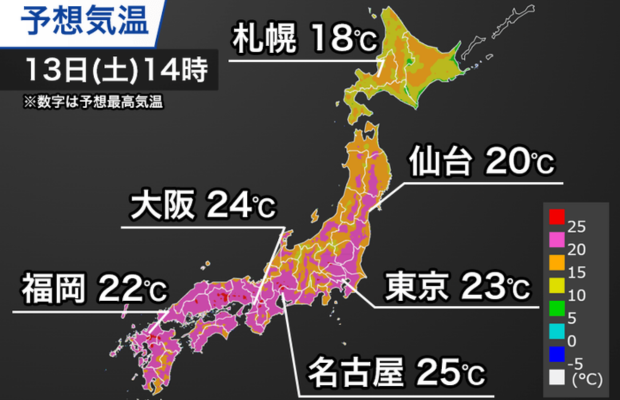 最高気温が25℃以上の夏日の予想の所もあり